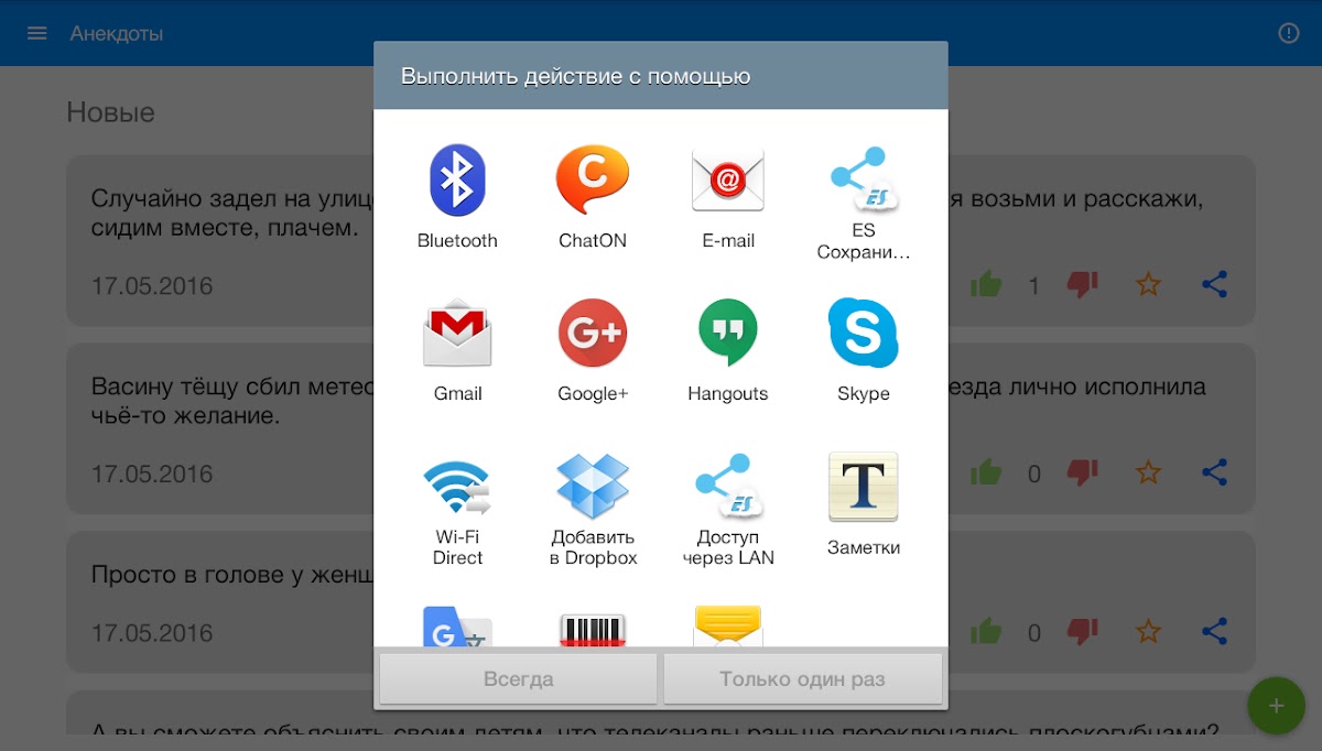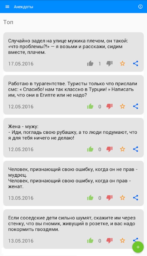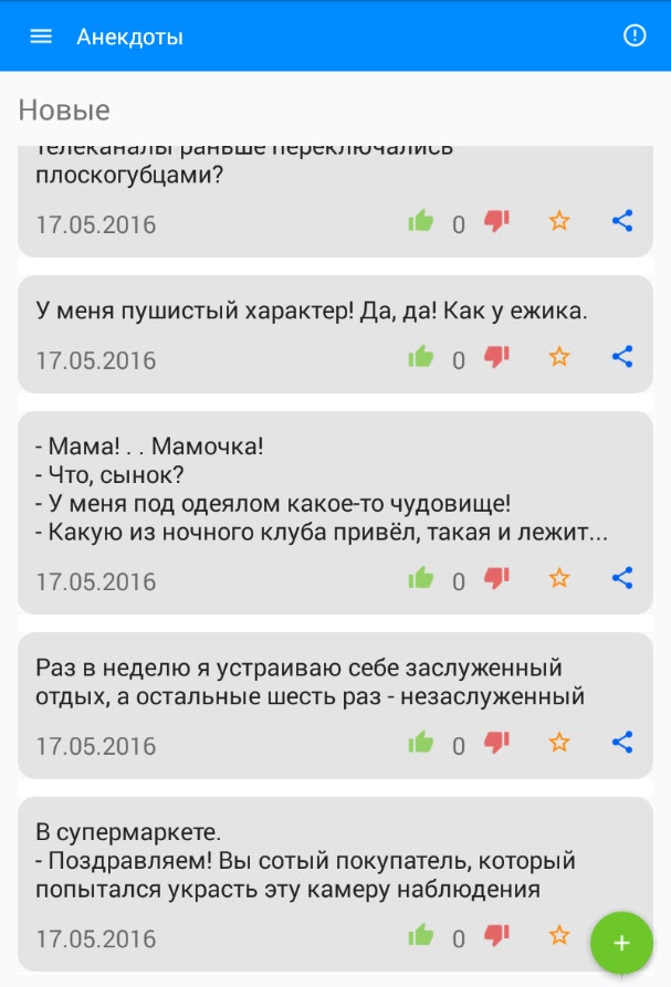 Понравившийся анекдот можно добавить в избранное, данный раздел доступен оффлайн и вы всегда сможете рассказать любимые анекдоты друзьям где бы вы ни находились Также можно поделиться шуткой, посредством социальных сетей или смс.