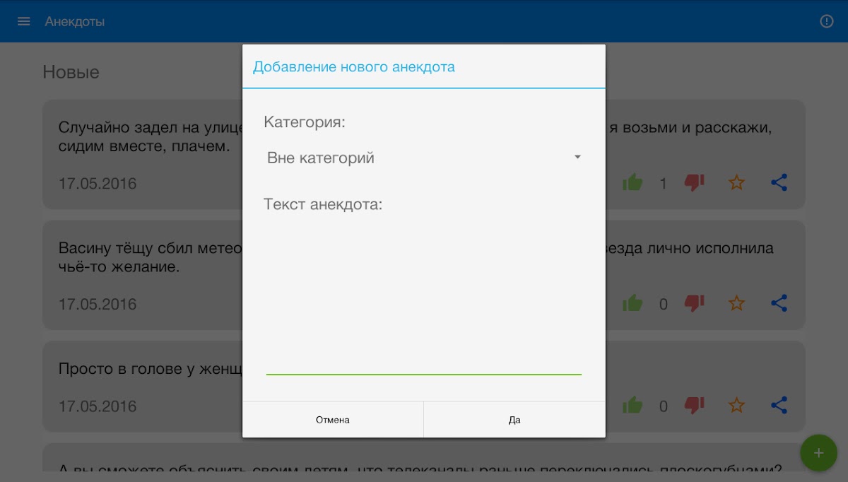Приложение с отборными приколами, шутками и анекдотами. Вы можете быть редактором и предлагать свои смешные истории, после одобрения модератором они будут доступны пользователям со всего Рунета.