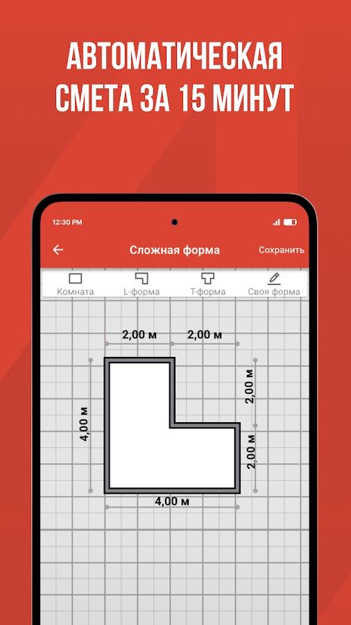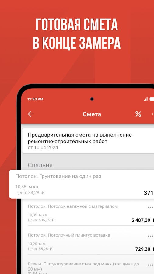 Замеры и планировка: легко производите замер площади помещения, стен, пола и потолка, планируйте работы с учетом всех деталей.