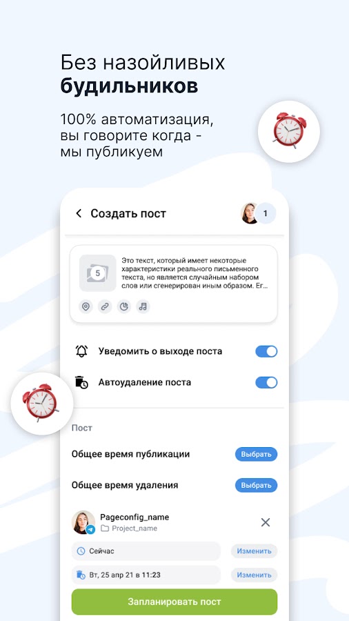 ✔ Автопостинг – загружайте контент и настраивайте расписание публикаций.