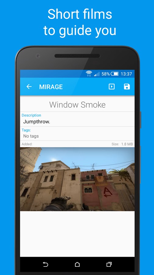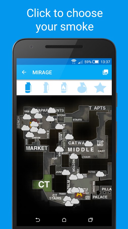 Более 1500 видео, которые покажут вам различные способы бросать гранаты на всех самых популярных картах Counter Strike: Global Offensive, в наиболее простых вариантах. Это приложение позволяет легко найти нужный вам смок, даже когда вы находитесь в середине игры, а постоянно растущая база данных видео автоматически обновляется каждый раз при запуске приложения.