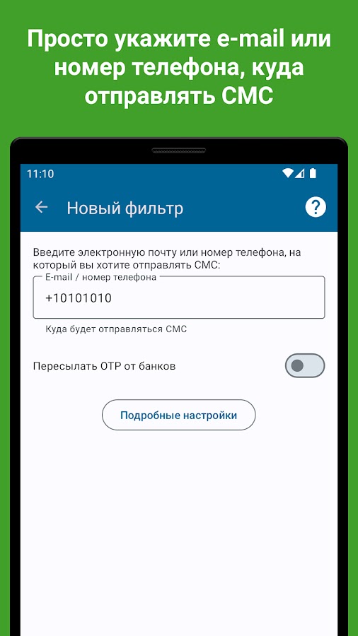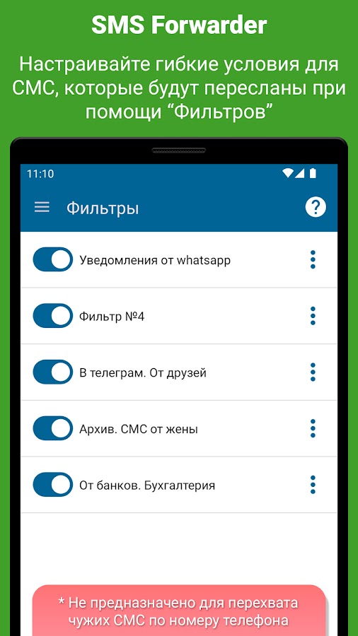 Внимание! Приложение не предназначено для перехвата чужих СМС, не позволит вам получить доступ к СМС супруга, утерянного телефона и т. д.