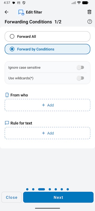 Укажите определенные ключевые слова (в номере отправителя или в теле сообщения) для фильтрации сообщений или оставьте поле пустым, чтобы пересылать все сообщения.