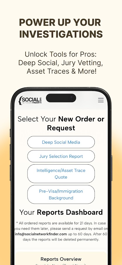 Следите за статусом запрошенных отчетов, отправляйте платежи, просматривайте и загружайте заполненные глубокие отчеты в социальных сетях о лицах, представляющих интерес.