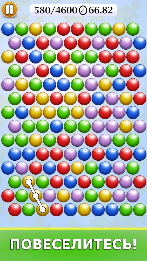 Играй в захватывающую игру о взрывании шаров. Чтобы заставить шары исчезнуть, соедини их в цепочку, передвигая пальцем по экрану. Чтобы взорвать шары, соедини их в группы из трех или более шаров одного цвета. Чем больше группа, тем больше очков ты получишь.