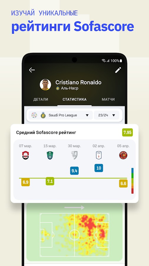 🔥 Тепловая карта: визуализируйте движения игрока на поле в каждом матче и в течение всего сезона.