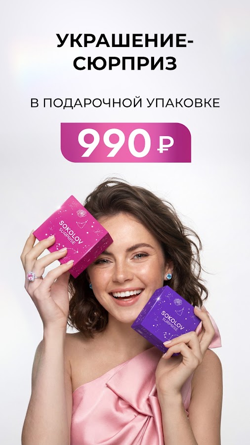 Добро пожаловать в ювелирный магазин SOKOLOV! Подобрать украшение с драгоценными камнями? Найти обручальное кольцо с бриллиантом? Купить наручные часы из драгоценного металла? Всё это можно сделать в удобном приложении! Используйте подробную систему фильтров, чтобы заранее указать любое предпочтение: от размера кольца и длины цепи до цвета камней и вида декоративного покрытия. Онлайн-магазин SOKOLOV – это личный ювелир, который всегда сумеет предложить вам лучшее украшение по выгодной цене. Побалуйте себя или найдите подарок для близкого человека – ювелирные изделия SOKOLOV помогут сохранить самые важные мгновения жизни!