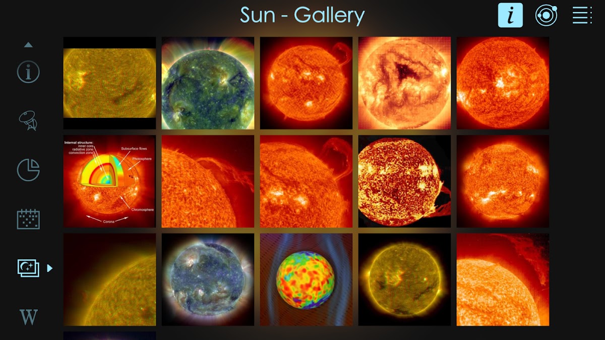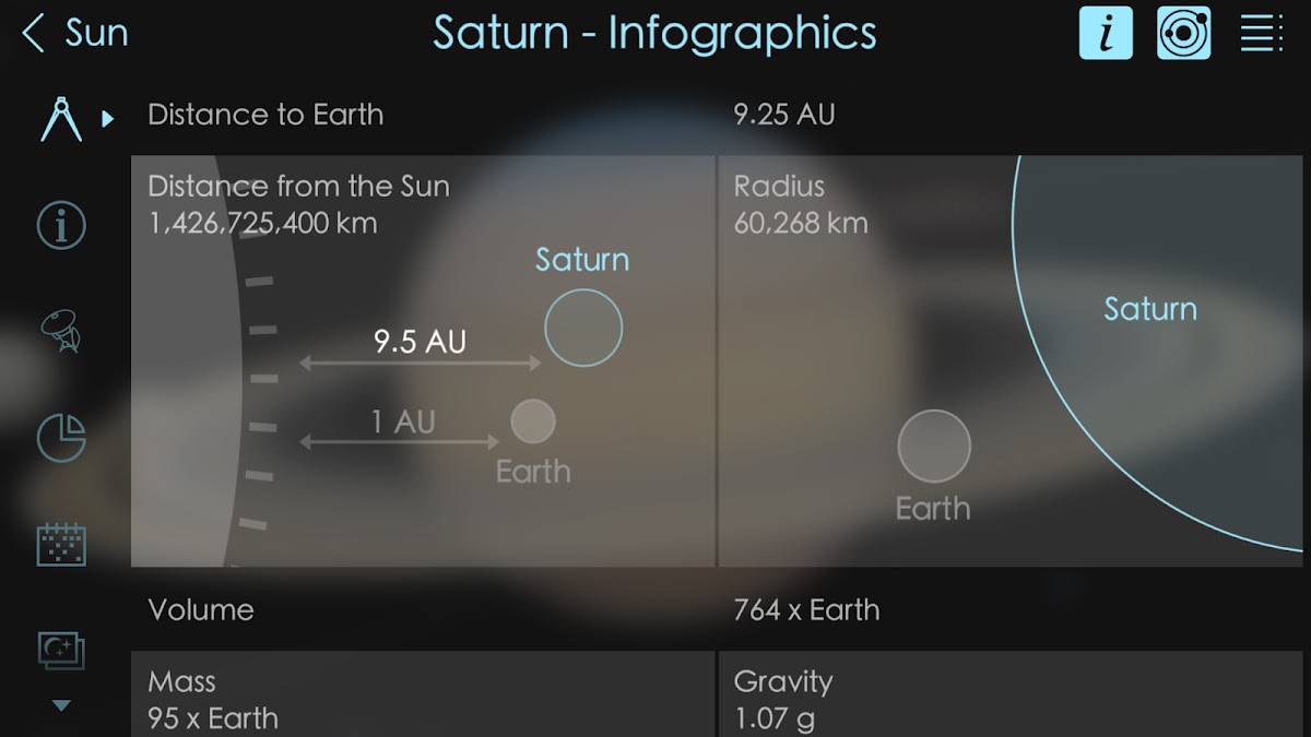 ● Встроенный календарь астрономических событий позволит вам всегда быть в курсе предстоящих затмений и других явлений, а также углубиться в историю освоения космоса, путешествуя во времени от одного астрономического события к другому.