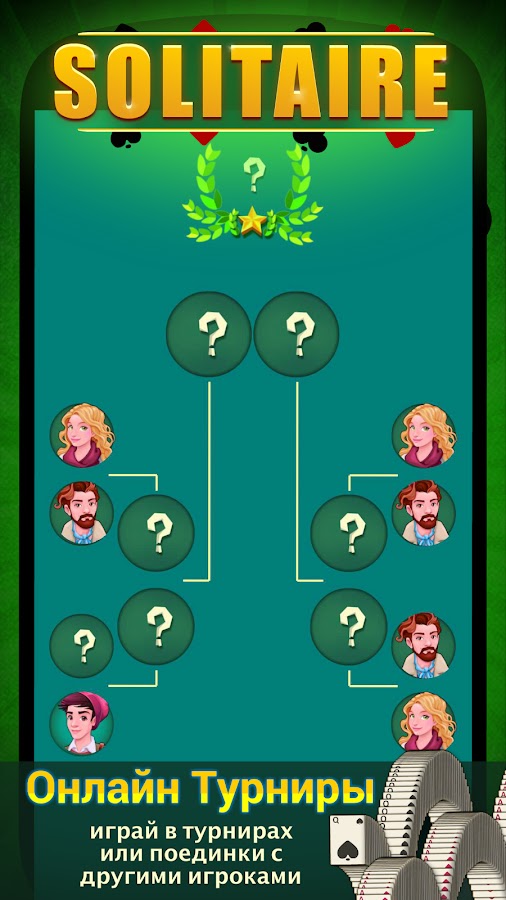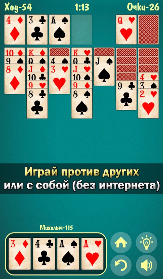 Играйте, наслаждайтесь! Соревнуйтесь с другими пользователями в ОНЛАЙН ТУРНИРАХ, либо ставьте свои личные рекорды в ОФФЛАЙН РЕЖИМЕ, интернет соединение не обязательно. Мы гарантируем — если на Вашем устройстве установлен наш пасьянс, вы никогда не заскучаете.