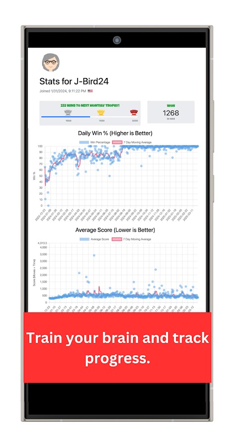 — Отслеживайте свои когнитивные способности и производительность, наблюдая, как со временем меняются ваши результаты, коэффициенты побед, время соревнований и общее количество ходов.