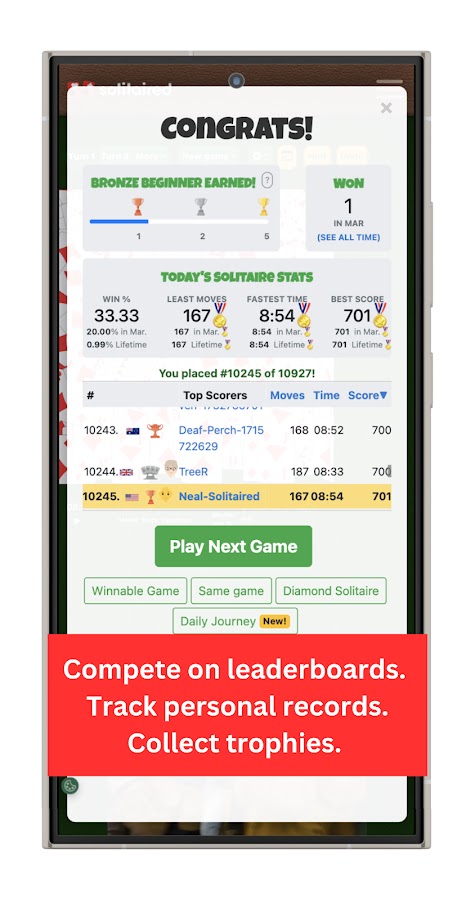 — Вы мгновенно подключаетесь к сообществу миллионов игроков в пасьянс, где вы можете видеть, как ваши результаты и общее количество побед складываются в глобальных таблицах лидеров.