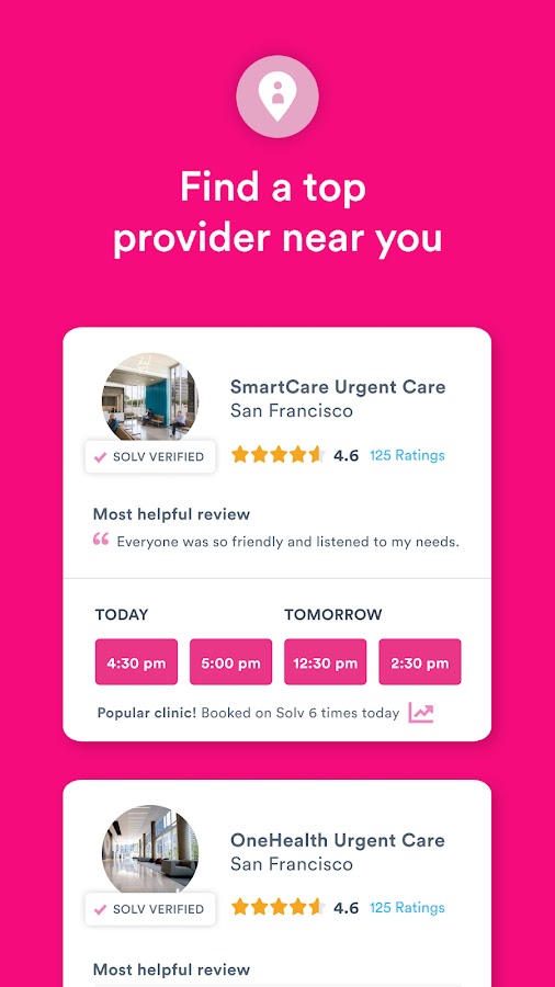 • Доступность в тот же день: 100% клиентов Solv могут записаться на неотложную помощь в течение следующих 24 часов.