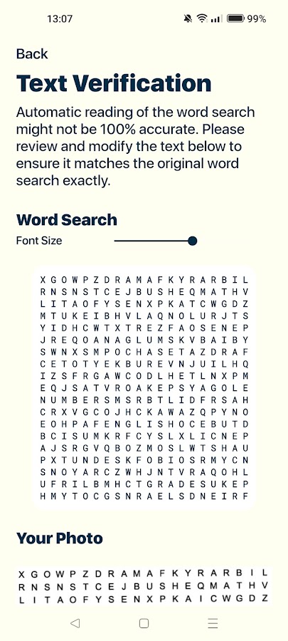 Поиск Слов Solver использует OCR для загрузки ваших головоломок. Забудьте переписывать всю вашу головоломку для загрузки! Это так просто, как сделать фото или выбрать его из вашей галереи, откорректировать поиск слов и начать искать это проклятое слово, которое вы не могли найти.
