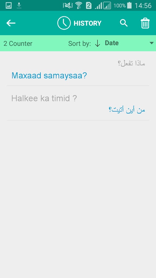 Это бесплатное приложение может переводить слова и текст с сомалийского на арабский и с арабского на сомалийский. Лучшее приложение для простого и быстрого перевода, которое можно использовать как словарь. Если вы студент, турист или путешественник, это поможет вам выучить сомалийский или арабский язык!