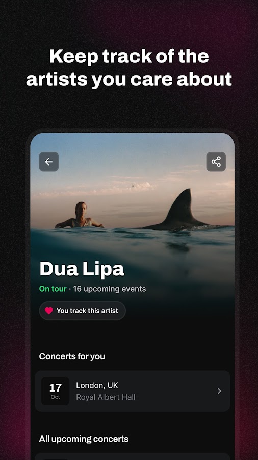 • Получить концерт и фестиваль уведомление для ваших любимых артистов.