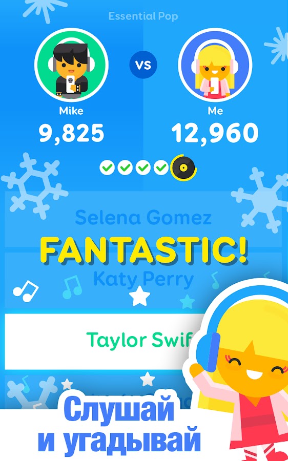 Слушайте фрагменты более чем 100 000 песен и угадывайте название песни или имя исполнителя как можно быстрее. Бросайте вызов друзьям или играйте с меломанами со всего мира Набирайте больше очков и побеждайте.