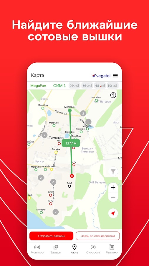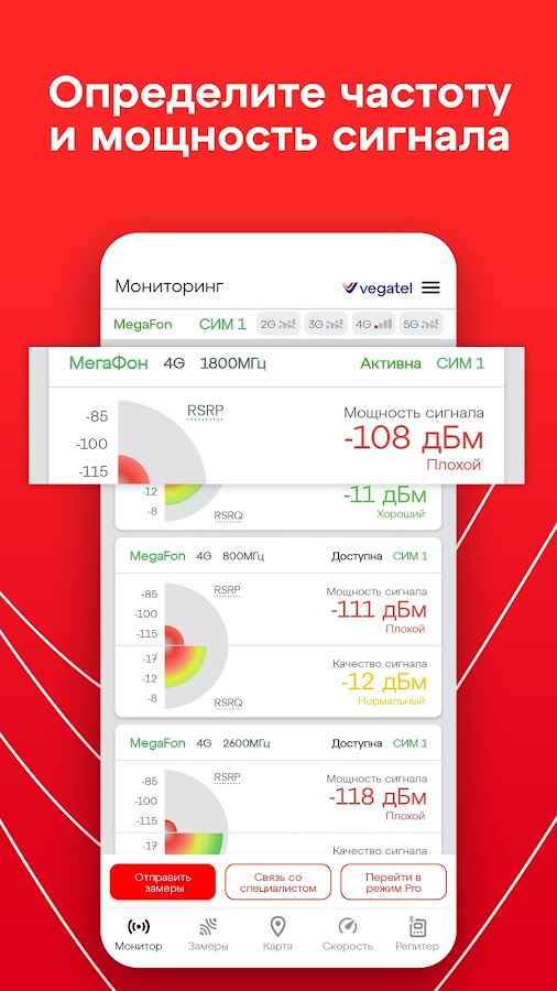Инструкция использования:https://www.vegatel.ru/articles/prilozhenie-vegatel-sotovye-vyshki-izmerenie-urovnya-signala-sotovoj-svyazi