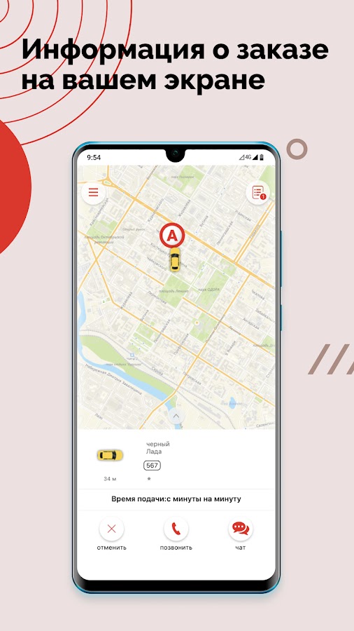 Ты всегда видишь на экране полную информацию о заказе: время подачи, марка, цвет и номер машины, имя водителя.
