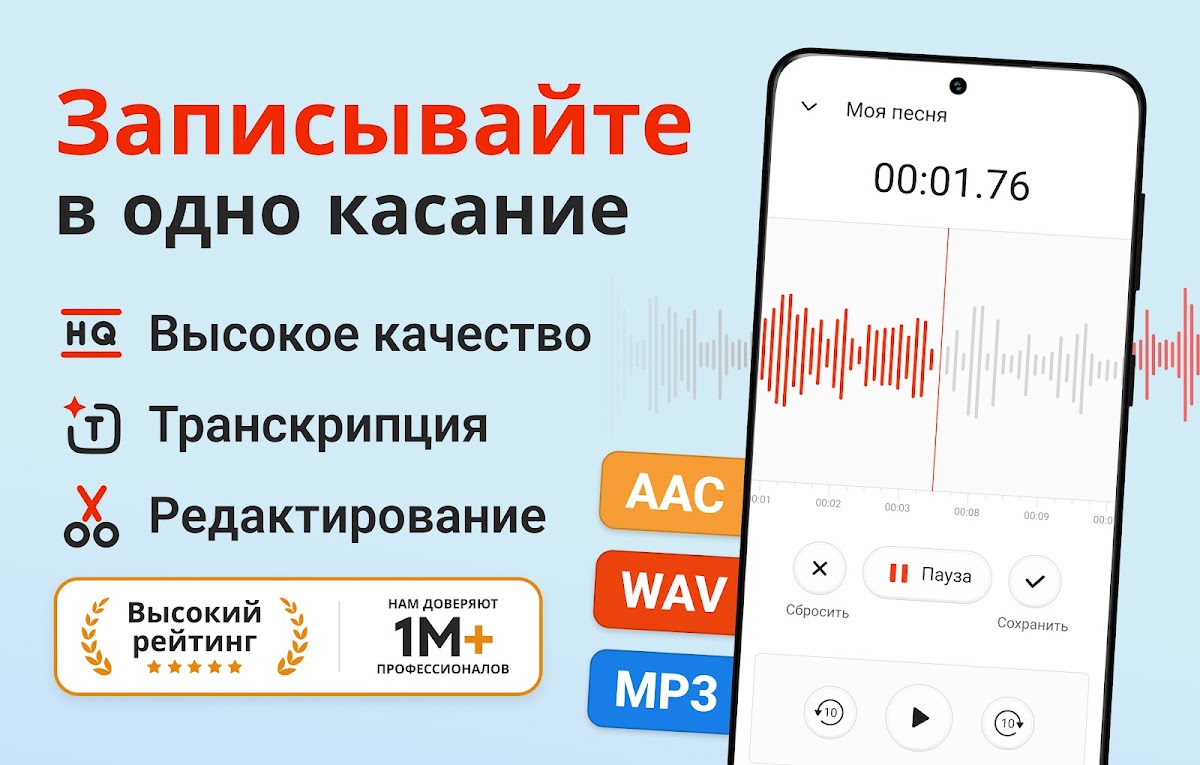 Звукозаписывающее устройство Диктофон Плюс поддерживает форматы записи звука AAC и WAV.