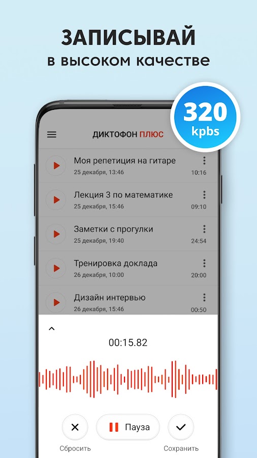 Диктофон Плюс имеет большой набор полезных функций для записи, воспроизведения и обмена в социальных сетях: