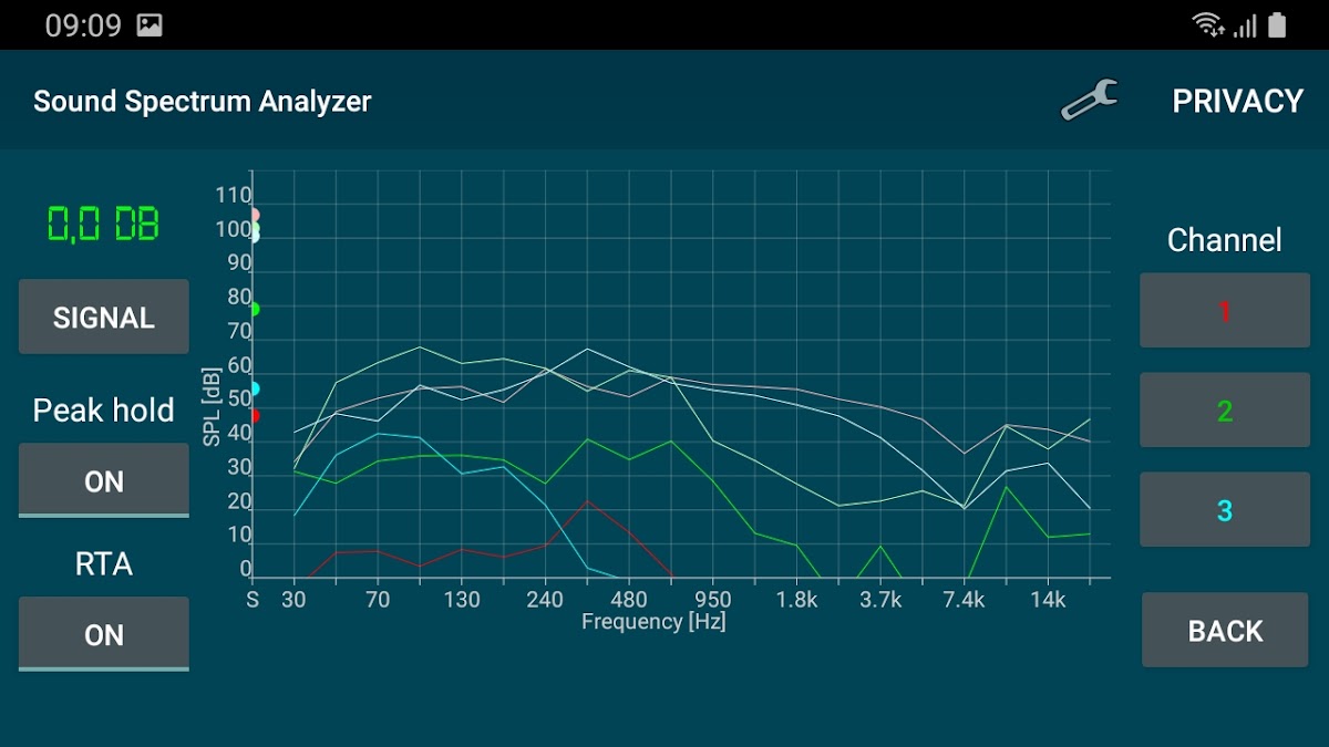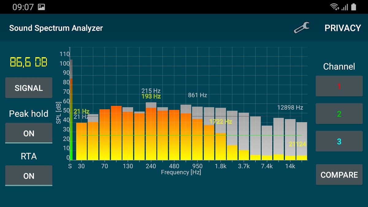 SPL анализатор спектра измеряет и анализирует уровень звукового давления (амплитуда в децибелах) и звуковой спектр частот в реальном времени (RTA) с использованием БПФ.