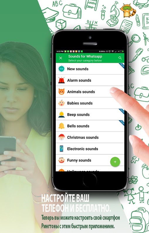 Звуки уведомлений для ватсаппе это бесплатное приложение, которое предлагает вам классные рингтоны. Более 1000 различных новых уведомлений для ватсаппе. Они классифицированы в 18 различных тематических категориях, чтобы было намного проще выбрать то, что вам нравится.