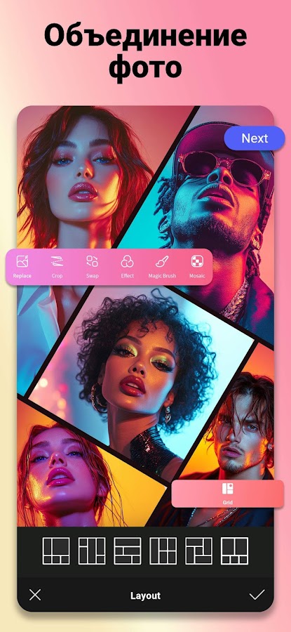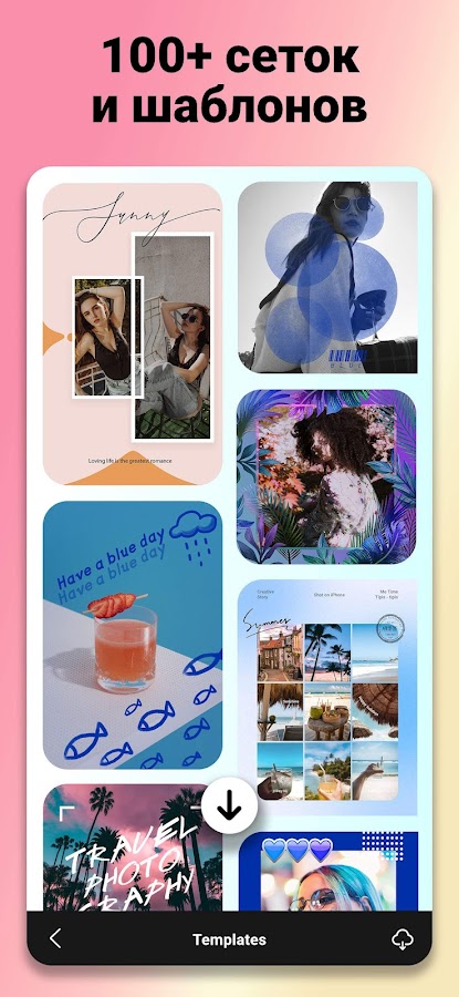 Разнообразие макетов сетки и шаблонов на выбор. Создайте квадратный фотоколлаж за секунды с помощью функции сетки. Просто выберите несколько изображений, и создатель коллажей превратит их в уникальный фотоколлаж. Вы можете выбрать понравившийся макет, отредактировать коллаж с помощью фильтра, стикера и текста. Объедините до 9 фотографий, чтобы создать коллаж, вы можете вращать изображения, настраивать рамки, редактировать границу коллажа, изменять цвет фона по своему усмотрению.