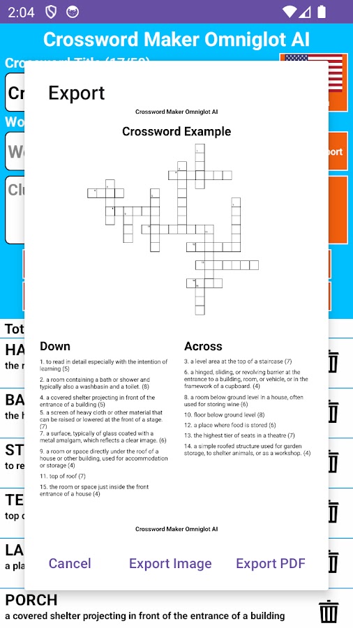 Приложение поддерживает обмен готовыми кроссвордами в виде изображения или PDF-файла с помощью любого из ваших любимых приложений; от электронной почты до WhatsApp, Facebook, Instagram и т. д.