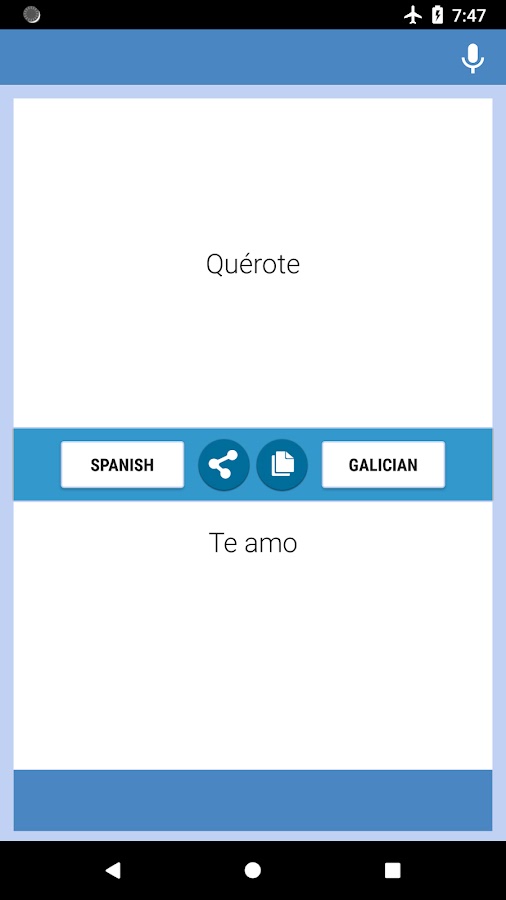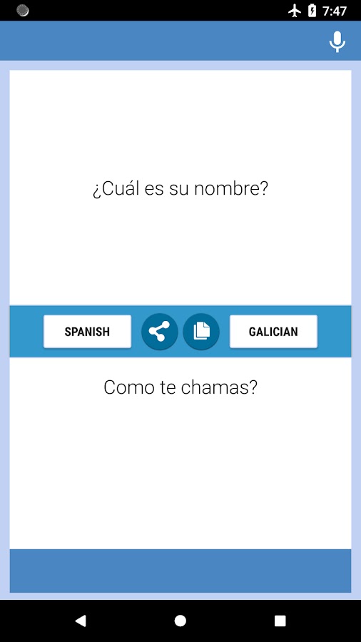Заявка-испанский переводчик галисийский — бесплатная и простая в использовании. Вы можете перевести текст и письмо от испанских и галицких галисийского на испанский язык. Вы можете использовать этот конвертер в работе, школах, встречах, во время путешествия или во время деловых поездок, чтобы улучшить свое мастерство этих двух языков. Вы можете также использовать это в качестве преобразователя, словарь или переводчик-галисийский галисийский.