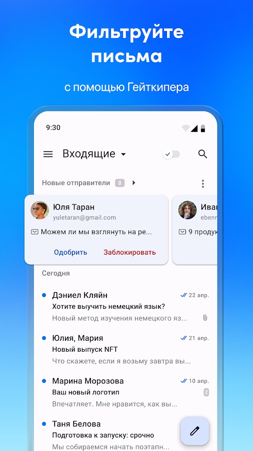 Проверяйте новых отправителей и решайте, могут ли они отправлять вам сообщения. Легко блокируйте нежелательных отправителей.