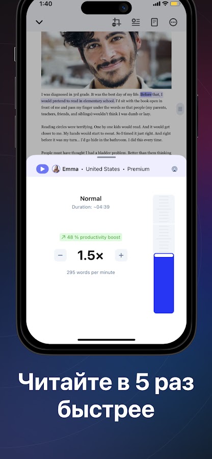— Получите доступ к естественным голосам высокой четкости Speechify для чтения с помощью Speechify Premium по ежемесячному, ежеквартальному или годовому плану. Голоса Speechify в формате HD используют естественные человеческие интонации, чтобы помочь вам быть еще более внимательными при чтении.