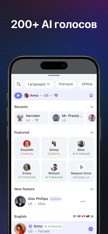 — Выберите голос диктора из множества вариантов и языков. Голоса представлены в высоком разрешении и на более чем 50 языках (включая английский и испанский).