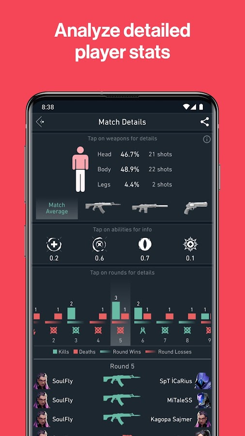 Spike Stats предоставляет подробную информацию по каждому отдельному матчу, который завершили игроки. Сюда входит информация о карте, имена и количество медалей, накопленных во время матча, информация KDA, а также ее разбивка (например, количество убийств по типу оружия), KAST, детали раундов, процент выстрелов и многие другие данные.