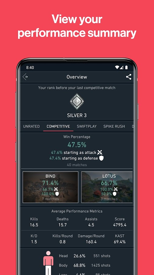 Spike Stats создает сводку прогресса игроков в последних матчах. Эта сводка включает в себя общий процент побед по каждому игровому режиму, процент побед по карте, процент побед, когда пользователь начинает матч в качестве нападающего или защитника, средние показатели производительности, такие как KDA, KAST и процент попаданий.