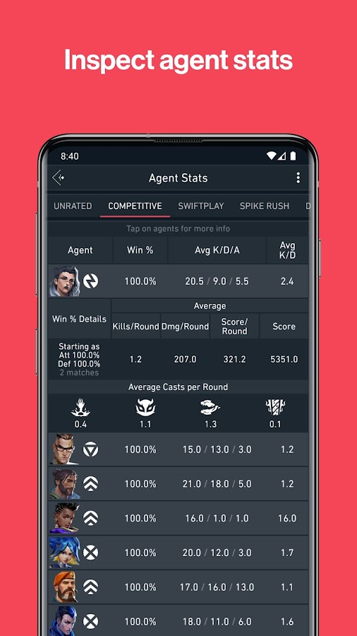 Spike Stats отслеживает результативность игроков для каждого агента и создает список. Он включает в себя такие данные, как процент побед и информацию KDA для каждого агента, выбранного игроком. Этот список также можно сортировать по указанным метрикам и фильтровать по ролям агентов.
