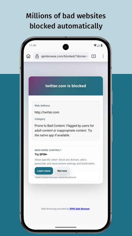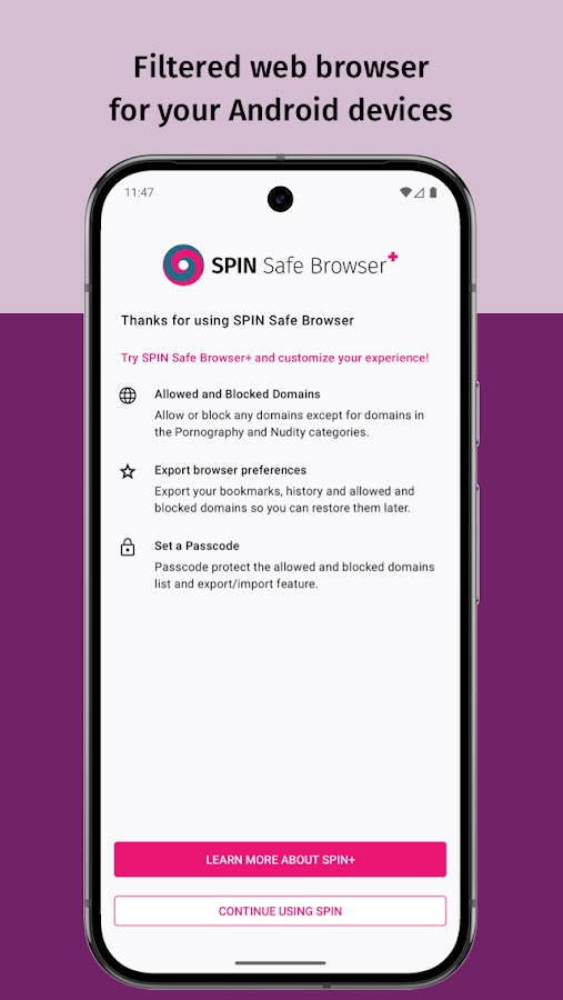 SPIN Safe Browser — это быстрый веб-браузер со встроенным интернет-фильтром. Он автоматически блокирует миллионы неприемлемых веб-сайтов и применяет строгие стандарты безопасности для обеспечения безопасного просмотра веб-страниц на устройствах Android.