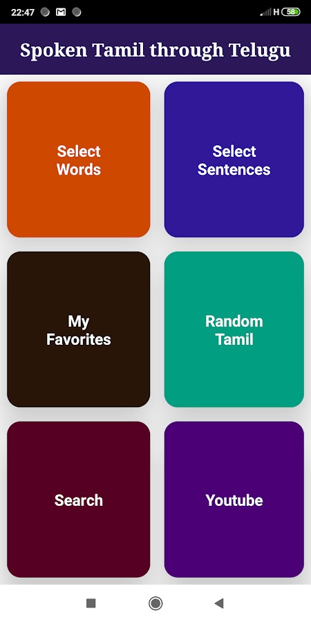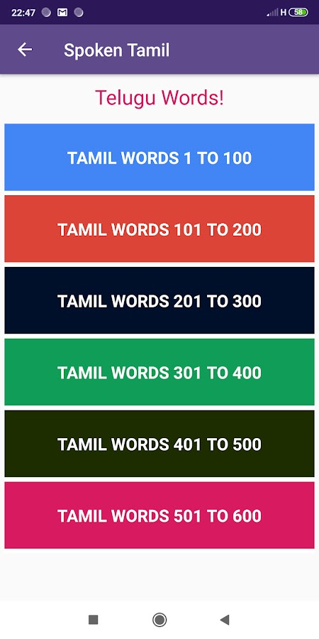 Учите тамильский язык через телугу. Это приложение в настоящее время имеет 600 тамильских слов и 350 тамильских предложений с чистым аудио.