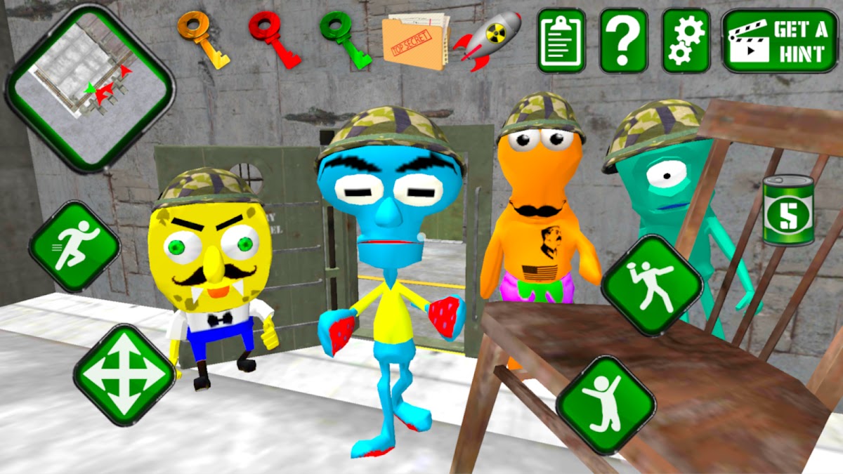 Как только вы прибыли на огромную военную базу, вы увидели пятерых страшных друзей-губок, идущих там. Вы поздоровались с ними, и они начали преследовать вас! Вам нужно исследовать эту странную область.