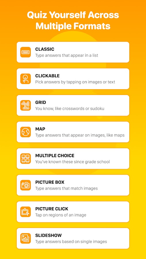 Если вы хотите получить опыт без рекламы и доступ к расширенной статистике, улучшенным параметрам поиска и специальным функциям, рассмотрите возможность обновления до Sporcle Orange — премиум-подписки приложения. Вы можете оформить подписку прямо в приложении, ежемесячно или ежегодно по сниженной цене. Новые функции и возможности добавляются постоянно!