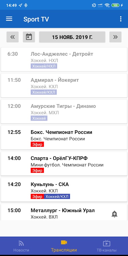 — Матчи хоккейных команд Экстралиги (Чемпионат Беларуси), КХЛ и НХЛ.