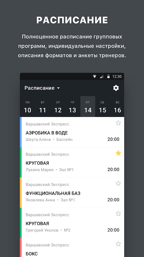 Полноценное расписание групповых программ, индивидуальные настройки, описания форматов и анкеты тренеров.