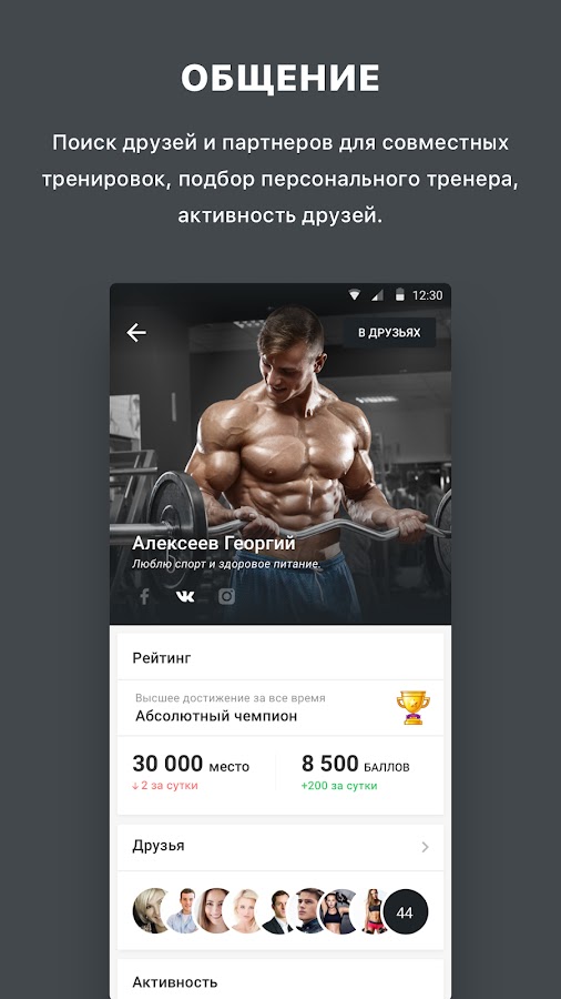 Поиск друзей и партнеров для совместных тренировок, подбор персонального тренера, активность друзей.
