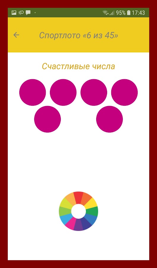 Это удобное и простое в использовании приложение , без лишних опций и настроек. Выбирайте интересующую Вас лотерею, нажимайте на круглую кнопку из разноцветных полосок и получайте комбинацию счастливых чисел.