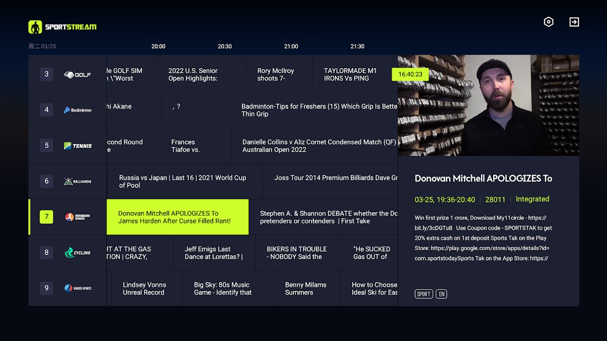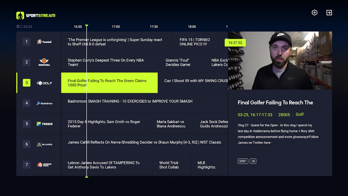 Благодаря точным прогнозам EPG, прямые трансляции транслируются вовремя, что позволяет вам быть в курсе последних событий спортивных событий в любое время и в любом месте и никогда не пропустить ни одного захватывающего момента.