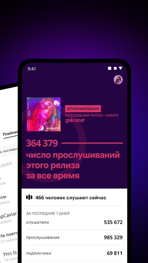 • Отслеживайте актуальную статистику по новым релизам. Получайте уведомления, когда ваш трек попадает в плейлист или количество подписчиков достигает новой отметки.