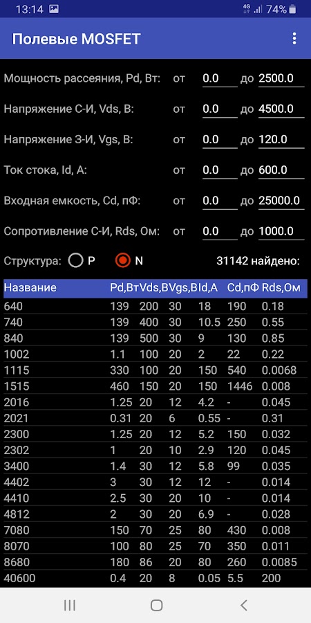 Для поиска по параметрам сначала выбирается соответствующая категория транзисторов. Затем указываются диапазоны значений необходимых параметров для выбранного типа транзисторов. Транзисторы, удовлетворяющие заданным параметрам, также будут выводиться в таблице ниже.