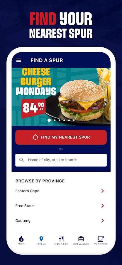 Всякий раз, когда вам хочется гамбургера, стейка, ребрышек или сладостей, воспользуйтесь нашим приложением, чтобы найти ближайший ресторан Spur Steak Ranches.