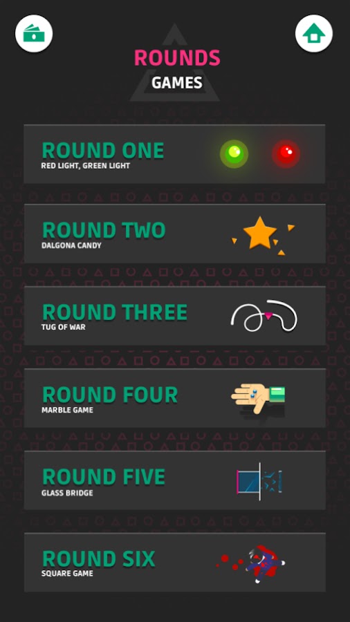 Играйте в «Красный свет», «Зеленый свет», «Конфеты дальгона», «Перетягивание каната», «Игру в шарики», «Стеклянный мост» и «Игру с ножом» и попытайтесь пройти все 270 уровней.