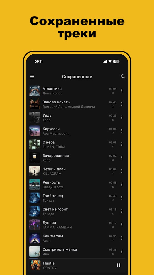 ● Офлайн-режим: Загружайте музыку в память устройства и слушайте её без интернета в дороге, на природе или в метро.