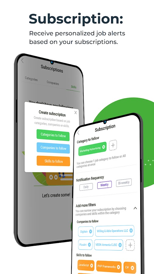 • Поиск компаний, навыков или категории в разделе «подписки»